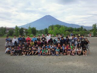 (写真は、河口湖湖畔での、朝のラジオ体操の後、富士山をバックの全体写真です。)